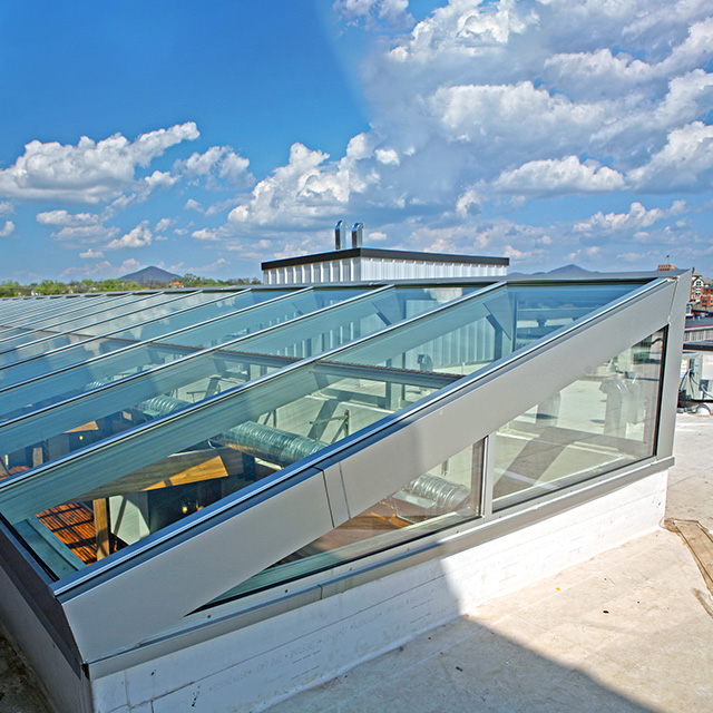 The Clear Glass skylights boast a construction comprising dual-plane laminated safety glass and tempered outer glass, resulting in a crystal clear view of the nature and sky outside your business. With a sleek 'picture frame' design, these skylights offer a comprehensive thermal break, enhancing performance, elevating aesthetics, and providing increased flexibility in curb positioning.